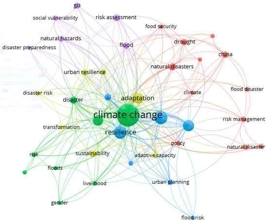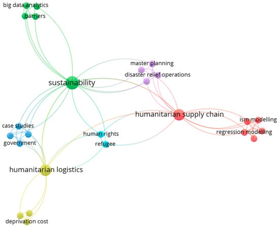The central and most prominent node, marked as a large red circle in Figure 10, is “humanitarian”, closely connected to the second largest red circle, “logistics”. “Humanitarian” is linked to key concepts such as “disaster relief”, “coordination”, “disaster management”, and “agility”, represented as smaller red circles. Additionally, “humanitarian” is connected to “supply chain management”, presented as a medium-sized green circle that further extends to smaller green circles, including “HSC”, “disasters”, and “aid agencies”. “Humanitarian” is also associated with “disaster relief operations” and “emergency logistics”, illustrated as small blue-colored circles. Lastly, “humanitarian” maintains connections to “sustainability” and “supply chain”, depicted as small yellow-colored circles. Figure 10, thus, emphasizes the crucial roles of humanitarian activities, logistics, disaster management, supply chain management, and sustainability in this research domain.