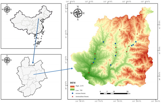 As an important part of terrestrial ecosystems, planted forests play an important role in restoring and rebuilding forest ecosystems, providing forest products, increasing forest carbon sinks, and improving the ecological environment [3]. However, afforestation activities have caused extensive habitat changes, which will inevitably lead to variations in biodiversity. Some scientists have carried out research on related issues [4,5]; however, most related studies focus on large-scale assessments, and there is still a lack of specific empirical studies on the impact of plantations on biodiversity [6].