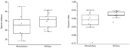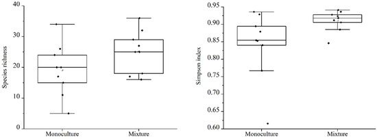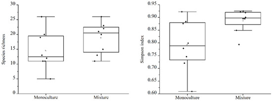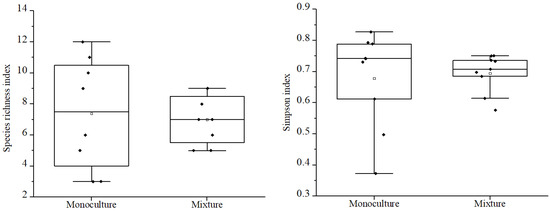 Our results showed that there was no significant difference in total understory plant diversity between monocultures (MON) and mixed forest conditions (MIX) and that there was no difference both in species richness and Simpson diversity index values (p > 0.05). The mean species richness of the MIX was 30.5 and the average species richness of the MON was 25.1. The average Simpson diversity value of the MIX was 0.926, and the average value of Simpson diversity of the MON was 0.885. The average species richness and Simpson diversity of the MIX were higher than that of the MON. Nevertheless, comparisons between the two groups showed no significant differences (Figure 2).
