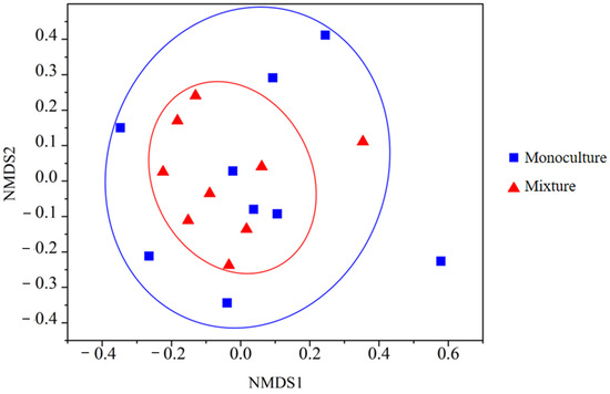 The results of non-metric multidimensional scaling (NMDS) analysis showed that there were differences in species composition between the MON and the MIX (Figure 6). Although the values of the different types of plots are not completely separated, the distribution of the pure understory plots is relatively scattered in the figure, indicating that the species composition differences between the different plots are relatively large, the distribution of mixed understory plants is relatively concentrated, and the species composition differences are small, presenting a nested structure as a whole.