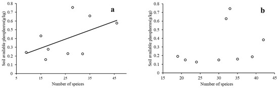 Linear regression between understory plant species richness and soil-available phosphorus in different types of forests ((a): monoculture, p = 0.02; (b): mixed forest, p = 0.48; no trendline for insignificant cases).