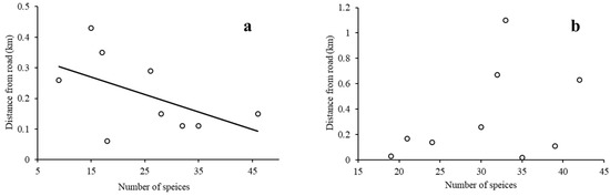 Linear regression between understory plant species richness and distance from the road in different types of forests ((a): monoculture, p = 0.02; (b): mixed forest, p = 0.36; no trendline for insignificant cases).