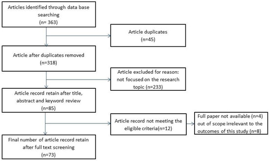 Following the outlined steps, a total of 363 references published between 1994 and 2023 were initially identified. After removing 45 duplicates, 318 records underwent screening based on title, abstract, and keywords. Among these, 233 records were excluded as they did not align with the research topic. Consequently, 85 records underwent eligibility assessment through full-text screening. From these, 4 records were excluded due to unavailability of full texts, and 8 records were deemed out of scope or irrelevant for the goals of this review. This included instances where the searched terms in the title, abstract, or keywords were not thoroughly explored in the papers. As a result, 73 records were deemed eligible for review.