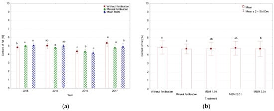 Content of fat, (a) average for year, (b) average for treatment, %. MBM—Meat and Bone Meal. Values followed by the same letters do not differ significantly in Tukey’s (HSD) test (p < 0.05).