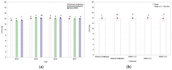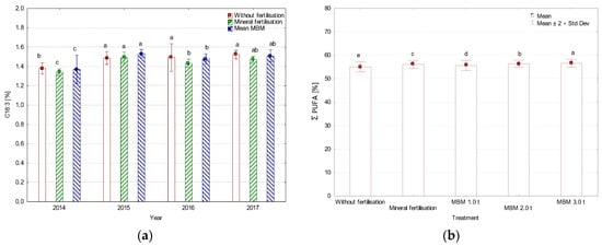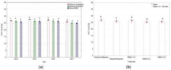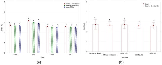 Content of C18:0 (stearic acid), (a) average for year, (b) average for treatment, %. MBM—Meat and Bone Meal. Values followed by the same letters do not differ significantly in Tukey’s (HSD) test (p < 0.05).