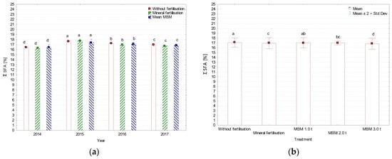 Sum of saturated fatty acids (SFA), (a) average for year, (b) average for treatment, %. MBM—Meat and Bone Meal. Values followed by the same letters do not differ significantly in Tukey’s (HSD) test (p < 0.05).
