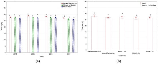 Sum of monounsaturated fatty acids (∑ MUFA), (a) average for year, (b) average for treatment, %. * MBM—Meat and Bone Meal. Values followed by the same letters do not differ significantly in Tukey’s (HSD) test (p < 0.05).
