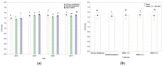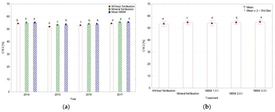 The highest C16:0 acid contents (above 14%) were determined in 2015 and 2016 (Figure 2). Regardless of the years, the highest amount of C16:0 acid was found on the variant fertilised with MBM at 2.0 t ha−1 and the least after the application of 3.0 t ha−1. In most variants of the experiment, an increase in C16:0 acid content was found in the study years compared to the first study year (Table 4). Such a relationship was not observed after the application of 2.0 t ha−1 MBM in 2015.