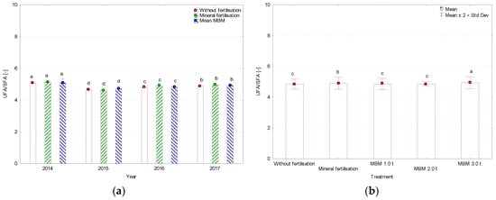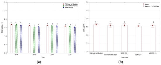 Ratio of unsaturated (UFA) and saturated (SFA) fatty acids (UFA/SFA), (a) average for year, (b) average for treatment, %. MBM—Meat and Bone Meal. Values followed by the same letters do not differ significantly in Tukey’s (HSD) test (p < 0.05).