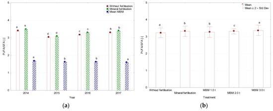 Sum of polyunsaturated fatty acids (PUFA), (a) average for year, (b) average for treatment, %. MBM—Meat and Bone Meal. Values followed by the same letters do not differ significantly in Tukey’s (HSD) test (p < 0.05).