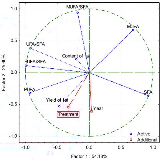 Correlation (Principal Component Analysis) of the treatment (fertilisation) and year on yield of fat, content of fat, saturated fatty acids (SFA), monounsaturated fatty acids (MUFA), polyunsaturated fatty acids (PUFA), and ratio of MUFA/SFA, PUFA/SFA, and UFA/SFA. The corn grain yields used to calculate the fat yield were taken from the authors’ earlier article, Stępień et al. [31].