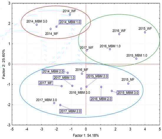 Projection of variables and variants on the plane of the first two main components. WF—without fertilisation; MF—mineral fertilisation; MBM—Meat and Bone Meal.