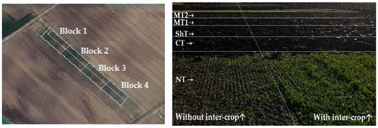 The long-term experiment was a two-factorial split-plot design in four replications (blocks) which includes: five different tillage treatments as the main plots and two inter-crop managements (with and without inter-crop) as sub-plots (Figure 1, Table 2). The crop sequence of 5 crops extended in time with and without inter-crops was consistent since 2013. All crop residues and straw after the harvest remained in the same areas and were not removed from the field where they grew. The gross size of each tillage plot was 210 m2 (10 m × 21 m) and 90 m2 (10 m × 9 m) of each inter-crop sub-plot.
