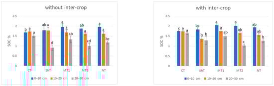 SOC accumulation in different soil tillage and inter-cropping systems, 2021. CT—conventional ploughing; ShT—shallow ploughing at 16–18 cm; MT1—harrowing at 8–10 cm; MT2—harrowing at 14–16 cm; and NT—no tillage. Standard errors are indicated in the bars on the columns. Different letters above the bars indicate significant differences between the treatments (n4).