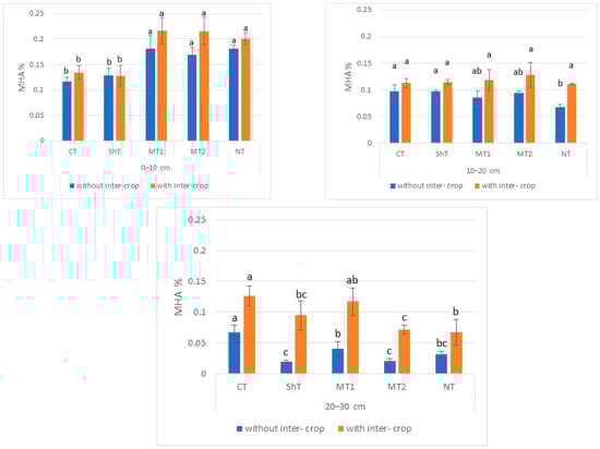 The data presented in Figure 3 show that MT1 and MT2 tillage systems, including inter-crops, resulted in highest amounts of mobile humic acids (MHA) in 0–10 cm soil layer. A similar, only weaker, trend was observed in a layer of 10–20 cm. It is interesting to note that the least influence on humification in NT and MT2 in a layer of 20–30 cm was exerted by inter-crops, since in the NT treatment plant residues were not embedded in the soil and did not have the opportunity to participate in the humification in this soil layer.