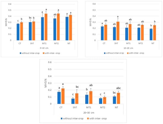 MHS demonstrates the course of mineralization and humification occurring in the soil in the first phases of the transformation of organic matter and this seems to indicate the viability of the soil. Therefore, with this study, it was concluded that different soil tillage systems and inter-crops influence processes of soil carbon changes and affect OM humification in soil forming MHS (Figure 4). MT1 and MT2 soil tillage treatments with inter-crops determined the largest accumulation of MHS in a layer of 0–10 cm, 0.442–0.445%, respectively. Using shallow tillage in a 10–20 cm layer formed significantly more MHS (0.308%), when inter-crops were grown. MT1 and MT2 soil tillage treatments determined the largest accumulation of MHS in a layer of 0–10 cm. MT1 and MT2 soil tillage treatments determined the largest accumulation of MHS in a layer of 0–10 cm. In the case of CT tillage, the content of MHS in the soil layer of 20–30 cm remained similar to that in a layer of 10–20 cm.