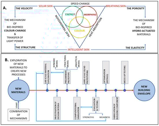 (A) The schematic diagram of combining natural mechanisms in order to create multi-stimuli-responsive systems that can respond to different stimuli; (B) the schematic diagram of the design processing within the framework for creating a new building component with material response/change.