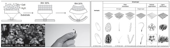 In general, there are two types of material structures that can induce hygromorphic shape changes: isotropic material and anisotropic material. For anisotropic material, the movement mechanism can be classified as some basic groups, including fibre orientation, which has different types based on the position of the fibre (such as unidirectional random (1D), bidirectional (2D) and multi-directional (3D)), and cellular organisation, and lignin distribution (Figure 2). Each bio-inspired system has a special mode of shape changing based on different material structures and the position of the active material. For example, animal hairs bend because of anisotropic swelling of the cortex layer, while an ice plant seed capsule unfolds due to the cellular organisation. This is because the hygromorphic transformation process of the cells [24,39].