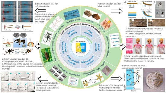 Notably, the materials/actuators discussed can be divided into biological materials that are related to “hygromorphic living material” and synthetic materials that are based on carbon and are known as “carbon-based material” [25]. To create actuators with desired functional and structural changes, several approaches have been proposed, which can be classified into two main groups based on the sort of material and/or structure. The first class is actuators which are inspired by fibrous biological organs such as hydrogel-based actuators that are created by lithography and 4D printing. The second class is actuators with bilayer and multilayer structures, which made up of a single component with different directions of different layers or several components in different layers, including an active layer that shrinks or expands under external stimulation and a passive layer that remains intact such as GO-based actuators that are fabricated by photo-induced reaction and direct laser writing (DLW) [11,12]. In terms of biological materials, WR materials can be found in three categories, including plants, animals, and microorganisms. And in terms of synthetic materials, it can be found in several categories, including polymer material-based actuators, GO and CNT material-based actuators, and other nanoscale porous structures [13].