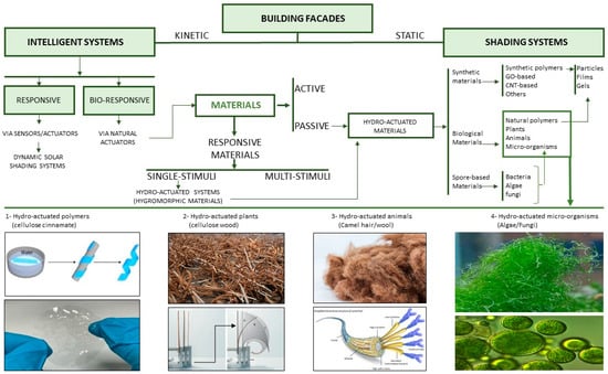 In order to achieve the successful transfer of biological motion principles (including their material-based sensing and actuation mechanism) to biomimetic soft components, detailed analyses of the form–structure–function relationships of the involved plant tissues and organs and their inherent material systems are indispensable [26]. The following five case studies have been selected because they present different types of hydro-actuated components that are derived from biological and spore-based hydro-actuated materials such as plants and living organisms. The process of categorising spore-based and biological materials is schematically illustrated in Figure 4.