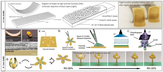 (A) Case study 4: Schematic depiction of a spore-based system, copyright 2021, Sustainability [43]. (B) Case study 5: Three-dimensional (3D) responsive actuator fabricated with lithography-based technique. Schematic diagram of the actuator and the process (from a to d) of creating 3D prototype, copyright 2019, Advanced Materials [25].