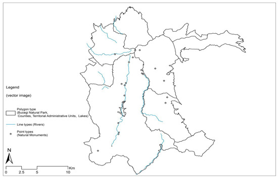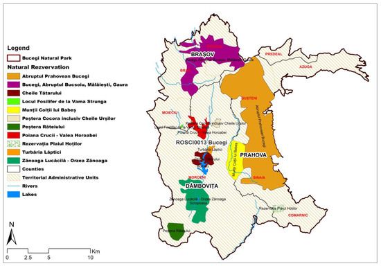 The administrative-territorial units (Figure 3) of any protected natural area are distinguished by factors such as the environment of origin of the local population to which they belong: urban or rural, the level of development, and the importance of the responsibilities assumed by each town hall or local or county council. Bucegi Massif is part of the Southern Carpathians, where altitudes reach over 2500 m. Thus, it is not a favourable area for practicing agriculture because the climate is not favourable, the temperatures are extremely low, and the slopes are very steep. Only scattered villages are found in the mountains. In comparison, in the Romanian Plain and the Western Plain, the temperatures are high and suitable for grain ripening, the soils are of a fertile chernozem type, and the population is much more compact.
