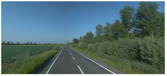 The road features a single carriageway with two lanes, each measuring 3.75 m, accommodating one lane for each direction of travel. Paved shoulders of a 1.50 m width are present on both sides, resulting in a total cross-section width of 10.50 m. This configuration represents the maximum cross-section for a C category road as specified by Italian regulations. Additionally, the road lacks grade-level intersections, only incorporating interchanges, and does not have any private access points. The entire route of the road is flat, and there are ample lateral spaces without obstacles that might impede an unobstructed view.