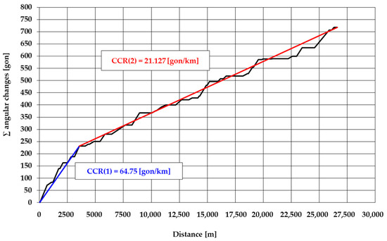 From a planimetric layout perspective, the road features a variety of curve radii (ranging from 480 to 10,000 m), long tangents (up to 1506 m), and transition curves (clothoids with scale parameters from 200 to 679 m) connecting the aforementioned elements. From a global standpoint, the route can be divided into two longitudinal sections with an average curvature change rate (CCR) of 64.75 gon/km from 0 to 3.573 km and 21.13 gon/km from 3.573 to 26.609 km (Figure 2).
