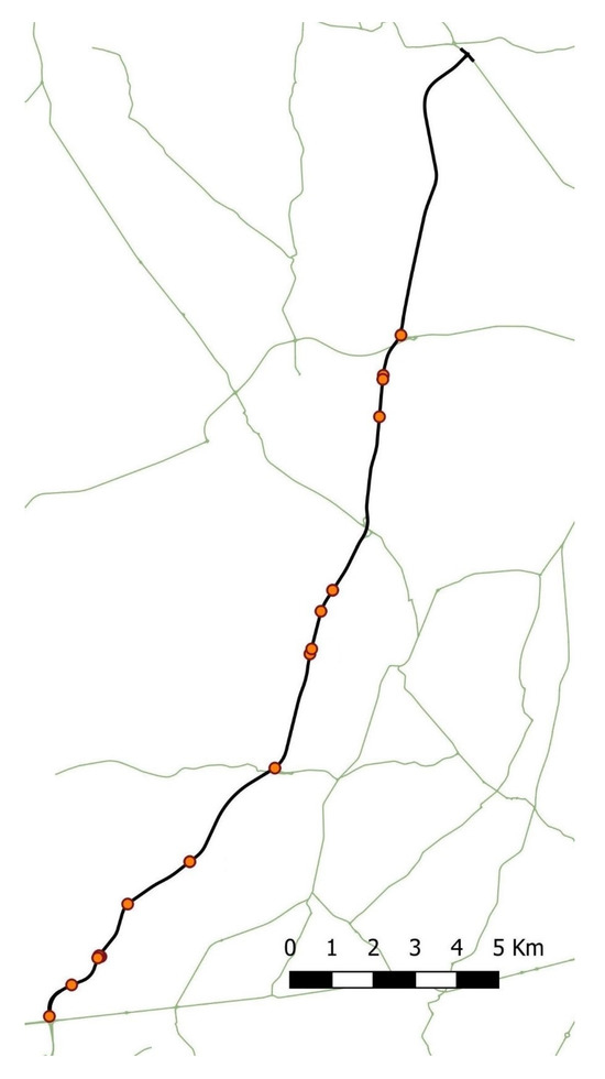 Fatal run-off accidents were identified and georeferenced along the road, with all incidents displayed in Figure 3. Several accidents were found to overlap at the same location.