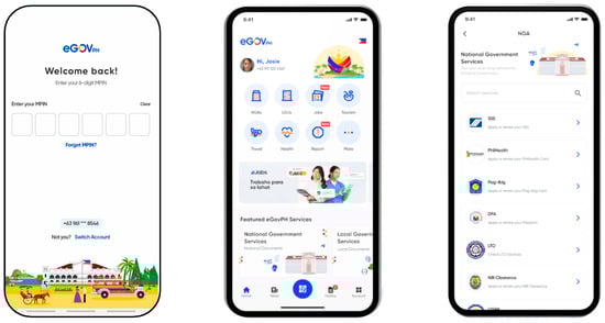 The eGov PH, also known as e-Government PH, is a one-stop-shop online platform that allows members to access government services and information online at local and national levels as well as perform various activities such as SIM registration, business registration, tax payment, accessing social security benefit, processing valid personal identification in digital format, engaging with e-tourism and e-travel guides, processing job applications, accessing healthcare information and feedback, conducting e-payments and banking services, and accessing helpful news [7,8,9,10]. This single application integrates with multiple government sectors such as the Local Government Unit (LGU), National Government Unit (NGU), Social Security System (SSS), and PhilHealth. The application is still in beta version and is further improving to integrate with other government sectors to make the interaction between the government and citizens easier and well-established in one application, which is accessible and available whenever and wherever. Moreover, it ensures transparency and integrity toward improving citizens’ well-being, thereby minimizing corruption and abuse in the country.