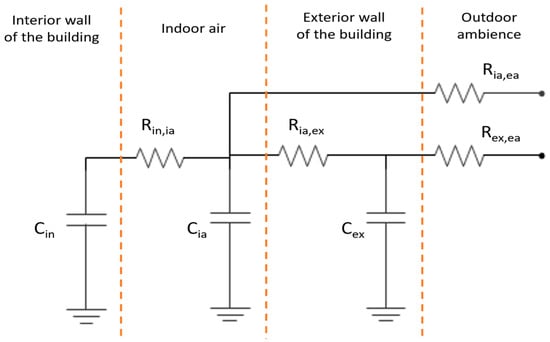 This type of RC model must be identified, i.e., applied to the example of the building, the different values of R and C in the different parts of the building due to the different TCLs have to be calculated or measured []. The value of C depends on the node’s ability to store energy in the form of heat. For example, the outer surface of a wall that absorbs energy depending on the solar radiation, its color, and its physical composition. Regarding R, the higher the thermal insulation of the wall, the higher its value because it opposes the heat transfer between the nodes representing the internal and external surfaces.