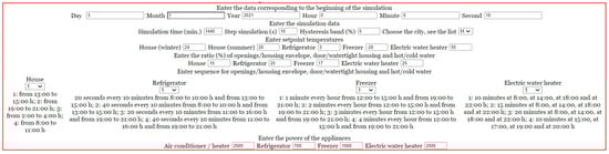 The fourth line allows to take into account the variation of the thermal resistances due to the opening of doors and/or windows (building), doors (refrigerator and freezer), and the contact of the incoming cold water with the internal hot water each time the electric water heater is used (outgoing hot water is replenished with incoming cold water). The meaning of the ratio (%) of openings/housing envelope, door/watertight housing and hot/cold water is as follows in each case: surface area of the open doors and/or windows in relation to the surface area of the envelope of the building, surface of the open door in relation to the refrigerator and freezer watertight housing and, finally, in the case of the electric water heater is the percentage of stored hot water consumed in each use. In the example shown in Figure 3 and by the same order: 10% (sum of the doors and/or windows) of the total envelope of the dwelling is open to the exterior, 20% (the surface of the refrigerator door is one-fifth of its total watertight enclosure), analogous to the freezer but now only 17% and, finally, 25% means that for each shower, one-quarter of the total hot water stored in the electric water heater is used and, subsequently, replaced by cold water.