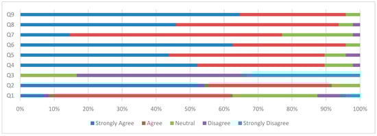 To measure the suitability as an educational resource of the proposed SBET-TCLs, students were asked to fill out a questionnaire with a set of questions on a 5-point Likert scale (1 = strongly disagree and 5 = strongly agree). The questionnaire was organized in different sections, focusing on the students’ level of knowledge of the subject, and on computer simulation-based learning, as well as on aspects of acceptance, design and usability of the simulation tool together with general considerations. Table 2 shows the survey questionnaire. To conduct this survey, a total of 48 students of the subject ‘Alternative Energy Sources’ (fourth-year elective) from the undergraduate degrees in Electrical Engineering (21% of students), Industrial Electronic Engineering (21%), Mechanical Engineering (29%), and Industrial Chemical Engineering (29%) of the University of Huelva were asked. The study was carried out in the second semester of the 2021–2022 academic year. The questions listed in Table 2 were asked to the students during laboratory sessions, when the teacher was already aware that they had understood the necessary theoretical concepts about the TCLs.