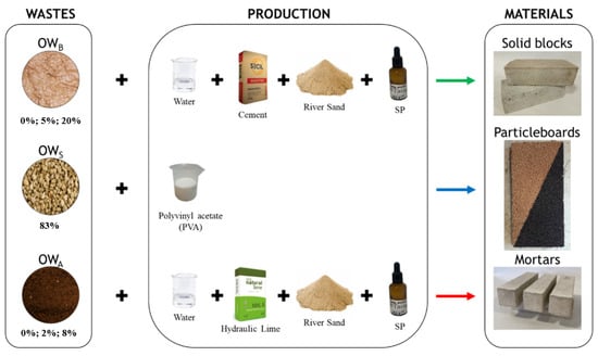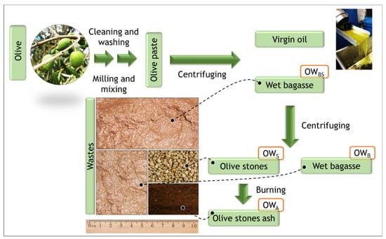 In this section, the main characteristics of the olive oil production wastes and by-products (OW) under study will be presented, and their incorporation as building material components will be described. The experimental procedure to evaluate the physical and mechanical properties of the innovative building materials will also be described.