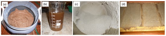 Production of OWB solid blocks: (a) OWB; (b) OWB with distilled water; (c) river sand; (d) molding phase.