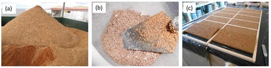As for OWS, this waste was reused as a raw material to obtain particleboards with dimensions of 20 mm × 200 mm × 400 mm, using polyvinyl acetate (PVA), an aqueous solvent, as a binder, with a density of 1240.00 Kg/m3, water resistance class D2, and pH 6–8. In this case, the particleboards containing 83% of olive stone were subjected to thermal performance evaluation. Figure 5 presents the different stages of the OWS particleboards’ manufacturing process. The olive stone content was maximized and the binder was minimized, ensuring the workability of the mixture.