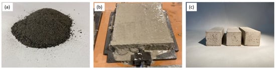 Production of OWA mortars: (a) OWA; (b) molding phase; (c) prismatic specimens after demolding and curing.