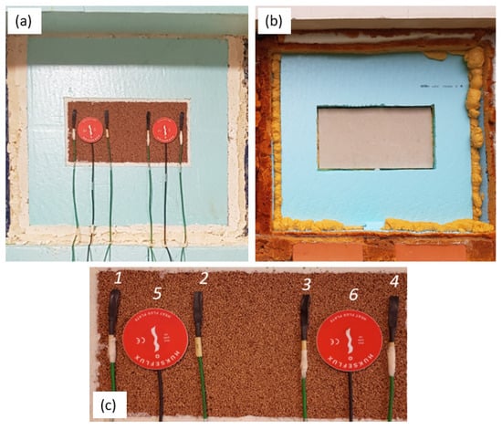 Experimental setup for the thermal performance assessment of OWS particleboard solution: (a) interior view; (b) exterior view; (c) sensor’s location in the OWs particleboard: inner surface temperature sensors: 1—Tsi11, 2—Tsi12, 3—Ts21, and 4—Tsi22; heat flux sensors: 5—HF1 and 6—HF2.