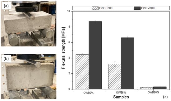 Flexural tests were carried out for different formulations of solid blocks, considering two possible directions of application (horizontal and vertical). The results are presented in Figure 8. The results obtained at 300 days lead to the conclusion that an increase in waste content results in a decrease in flexural strength. Furthermore, as observed in Figure 8c, blocks with 5% OWB present different values of strength in the two directions, showing a higher one in the vertical position due to increased inertia when compared to the horizontal position. However, an increase to 20% waste leads to significantly lower values of strength, and no representative difference is identified, depending on the position of the block when subject to the mechanical test.