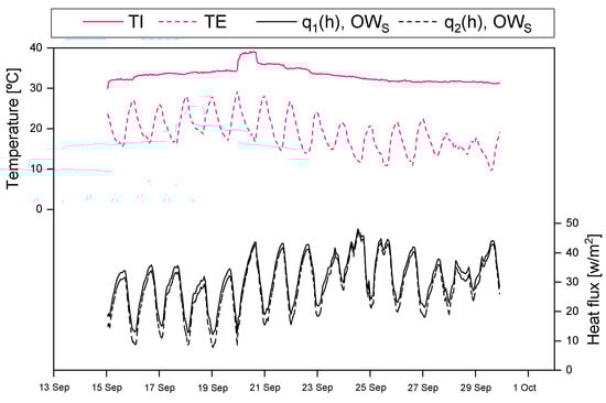 The particleboards containing OWS were subjected to an experimental analysis of thermal performance, allowing us to obtain the heat flux variation and the corresponding thermal performance coefficient. Indoor and outdoor temperatures were also continuously measured, allowing us to obtain the variation in Ti and Te values. Figure 9 presents the values acquired by the two heat flux sensors, q1(h) and q2(h), during the measurement period. The values of the interior (Ti) and exterior (Te) temperature are also represented, showing that indoor temperatures were always higher than exterior temperatures, as required to ensure the reliability of the results. Stabilization of the interior temperature was guaranteed for almost the entire period, except between 20 and 21 September, characterized by an increase in Ti values, which was due to an uncontrolled change in the heating device located inside the test room. However, given that this situation occurred during a very short period compared to the entire measurement period, it can be considered negligible.