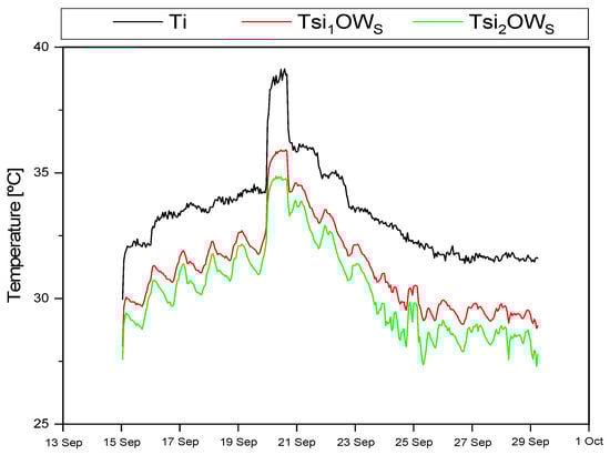 The variation of inner surface temperatures was also measured. Given that the values obtained by sensors Tsi11 and Tsi12 and Ts21 and Tsi22 are quite close, Figure 10 only presents the average values, designated as Tsi1 and Tsi2, respectively. As expected, the surface temperature curves are similar to those obtained for heat flux and present values lower than those obtained for the temperature of the test room. A variation of the curve’s amplitude is visible, with lower Tsi2 values, which may be related to an area with a higher PVA concentration, which presents a higher thermal conductibility compared to OWS. However, this differential corresponds to a maximum of 1.9 °C and a minimum of 0.3 °C. Regarding the mean values obtained by the sensors, Tsi1 achieved a minimum of 26.5 °C and a maximum of 36.1 °C, while for Tsi2, these values were 26.2 °C and 35.0 °C, respectively.