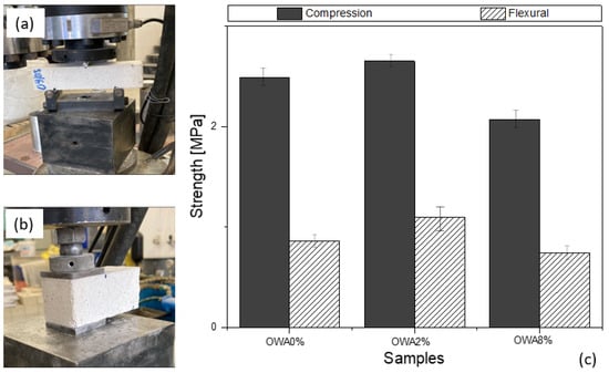 Flexural (a) and compression (b) experimental procedure for mortars; (c) strength results at 28 days of curing.