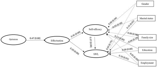 We used partial least squares (PLS) to test the hypotheses and answer the research question. The PLS structural equation modelling (SEM) was employed to examine the explained variance and the significance and the size of the coefficients in the structural paths. PLS is a variance-based SEM that is useful for exploring the associations between latent variables and explaining variance in the dependent variable [70]. We used SmartPLS (V.4.0.9.6) software to test our model. A non-parametric bootstrapping technique (with 5000 subsamples) was used to assess the precision of the structural paths in our model. The model’s fit indices showed a good fit (SRMR = 0.08 and NFI = 0.84). Figure 1 illustrates the structural model. Marital status had a significant relationship with SWL, the level of education had a significant effect on both of our dependent variables and employment status had a significant relationship with SWL. The structural model supported Hypothesis one, showing a significant association between the optimism of the citizens and their application of effectuation in their daily decision-making (β = 0.47, t = 15.88, p < 0.01). Hypothesis two tested the effect of effectuation on citizens’ self-efficacy, and the result supported the hypothesis (β = 0.45, t = 13.43, p < 0.01). Hypothesis three tested the effect of effectuation on satisfaction with life, and the result was significant (β = 0.20, t = 5.25, p < 0.01). We also tested the effect of self-efficacy on satisfaction with life (Hypothesis four), and the result supported the positive effect (β = 0.37, t = 8.78, p < 0.01).