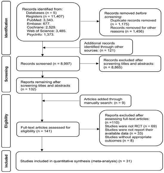 The search strategy yielded 11,407 records from five electronic databases potentially related to the research theme. After eliminating 1175 duplicates and discarding preliminary studies and records lacking sufficient research information, 121 articles were identified and included by referencing similar reviews. Consequently, 8997 studies underwent independent title and abstract screening by two authors. Subsequently, 132 publications and nine articles identified through manual search were selected for in-depth full-text review and further evaluation. Ultimately, 31 studies [14,17,19,20,21,22,23,24,31,32,33,34,35,36,37,38,39,40,41,42,43,44,45,46,47,48,49,50,51,52,53] were included in the systematic review and quantitative meta-analysis after excluding 69 studies that were either non-RCTs, lacked essential data, or failed to report critical results. Figure 1 comprehensively illustrates the complete literature selection process.