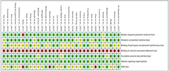Risk of bias summary for include studies (green: low-risk; yellow: unclear; red: high-risk) [14,17,19,20,21,22,23,24,31,32,33,34,35,36,37,38,39,40,41,42,43,44,45,46,47,48,49,50,51,52,53].