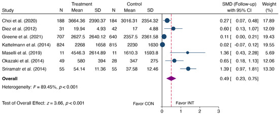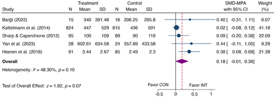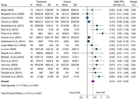 Applying a random effect model and the SMD, the synthesized effects of TPA during the follow-up period indicate a significant improvement in TPA (SMD = 0.49, 95% CI: 0.23, 0.75, p < 0.001) (shown in Figure 10), favoring the PA intervention group, approaching a medium-sized effect size. Due to fewer than three studies measuring other PA outcomes during the follow-up period, no meta-analysis was conducted for these outcomes.