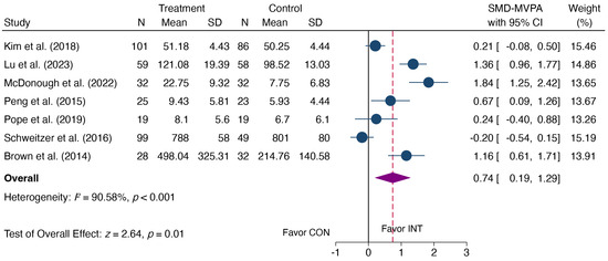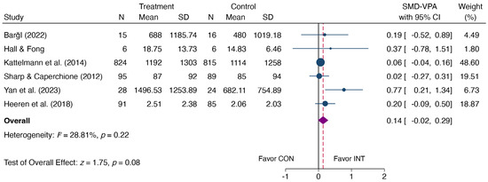 Regarding MVPA, it is widely employed by WHO and various health entities for monitoring PA and recommending guidelines. This study observed a significant intervention effect with an effect size nearing large. Similar findings were reported by Whatnall et al. [10] in young adults and Plotnikoff et al. [25] in university students, aligning with our results. Moreover, meta-analyses across different age groups, including adolescents [56], women [57,58], elderly people [59], and patients [60], have demonstrated significant improvements in MVPA due to interventions. This contrasts with another meta-analysis focusing on university students, where Favieri et al. [26] identified a medium effect size in MVPA enhancement through interventions. Still, the aggregate effect size lacked statistical significance. To resolve inconsistencies stemming from these aggregated results, synthesizing data using uniform measurement tools and establishing consistent eligibility criteria could reduce methodological heterogeneity, potentially mitigating discrepancies in the summarized findings.