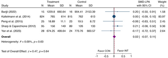 Furthermore, regarding heterogeneity in the synthesized results, no heterogeneity was observed for LPA at post-intervention, while moderate heterogeneity was found for MPA and VPA. High heterogeneity was identified for post-intervention TPA, MVPA, and step count. Similarly, high heterogeneity was found for TPA during the follow-up period.