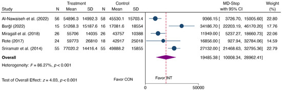 Utilizing a random effect model and the SMD, the synthesized effects on various PA outcomes at post-intervention are as follows: The PA interventions demonstrate a statistically significant small effect in TPA (SMD = 0.41, 95% CI: 0.27, 0.55, p < 0.001) (shown in Figure 4) and a significant effect in increasing MVPA (SMD = 0.74, 95% CI: 0.19, 1.29, p < 0.001) (shown in Figure 5), reaching an approximate high effect size level. However, the PA interventions do not yield significant effects on enhancing VPA (SMD = 0.14, 95% CI: −0.03, 0.29, p = 0.08), MPA (SMD = 0.18, 95% CI: −0.01, 0.36, p = 0.10) (shown in Figure 6), and LPA (SMD = 0.02, 95% CI: −0.07, 0.11, p = 0.63) (shown in Figure 7). Employing MD for the combined effect size of step count ((MD = 19,485.38, 95% CI: 10,008.34, 28,962.41, p = 0.001) (shown in Figure 8), the PA intervention group significantly increased weekly steps by 19,485.38 compared to the control group (shown in Figure 9).