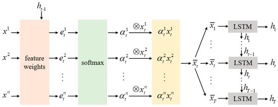 Module 2: Input feature extraction. This module is used to adaptively select the relevant driving sequences. Given the input driving sequence, an input attention mechanism is constructed according to a deterministic attention model, a multi-layer perceptron, by referring to the hidden state and the previous moment in the LSTM cell state in the encoder. The input attention mechanism is a feed-forward network that can be trained jointly with other derivatives of RNNs, and these attention weights can be extracted adaptively to drive the sequence. Then, the hidden state at the time step can be updated. By utilizing the proposed input attention mechanism, the encoder can selectively focus on some specific driver sequences instead of treating all input feature sequences equally. The flow structure of the input attention mechanism is shown in Figure 4.